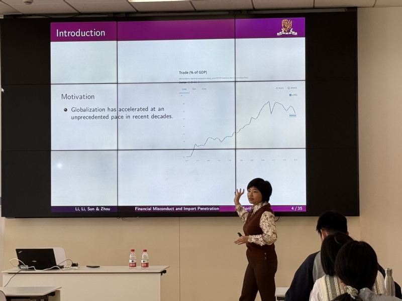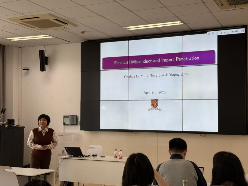 2025年4月8日,由香港中文大学经济管理学院主办的学术报告会在学院学术报告厅隆重召开。此次报告由会计学院教师王娟婷主持,周雨晴助理教授以《财务不当行为公告对进口渗透率影响的研究》为题,详细阐述了她和团队最新完成的研究成果,并对相关理论与实证分析进行了全面解读。学院金宇超、董雅姝、官峰、饶艳超、顾瀚驰等多位教师以及十多位硕士和博士生参与了讨论,与会人员纷纷表示期待通过此次报告进一步推动金融监管与国际贸易领域的学术交流。