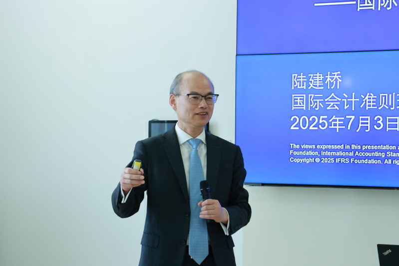 2025年7月3日,由上海财经大学会计学院主办的学术报告会在学院108室召开,国际会计准则理事会理事陆建桥博士受邀作题为《更好的信息,更好的决策——国际财务报告准则的最新进展》的主题讲座。报告由会计学院教师陈信元老师主持,学院靳庆鲁、唐松、黄俊、叶建芳、侯青川、王翼虹、邹欢、王刚、官峰、蒋德权、李挺、马慧、陈凤钦、张程、吴凯文等多位教师、二十多位硕士和博士生以及实务界人员参与了讨论。