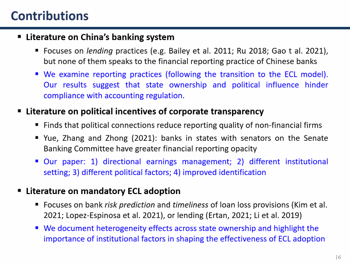 银行是重要的流动性提供者,对经济稳定至关重要,贷款损失拨备是银行最重要的应计项目,反映了相当大的管理自由度。虽然银行的贷款损失确认是众多研究和最近监管改革的焦点,但鲜有证据表明政治机构和银行所有权如何影响改革的结果。佘国满老师和他的合作者通过中国强制从已发生的信用损失(ICL)拨备转向预期信用损失(ECL)拨备这一事件,来检验政治力量如何影响银行的贷款损失确认。