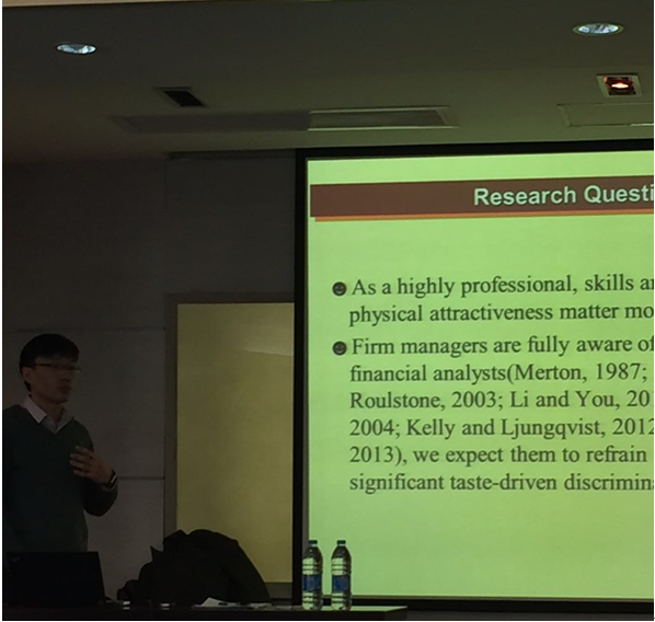 本次讨论会邀请来自上海立信会计学院的官峰老师做学术报告,报告题目是《More than Skin-deep? Analysts’ Beauty and Their Performance》。讨论会由上海财经大学会计学院董慧老师主持。上海财经大学会计学院院长李增泉教授、副院长薛爽教授等会计学院教师以及部分在读博士生和硕士生参加了此次学术报告。